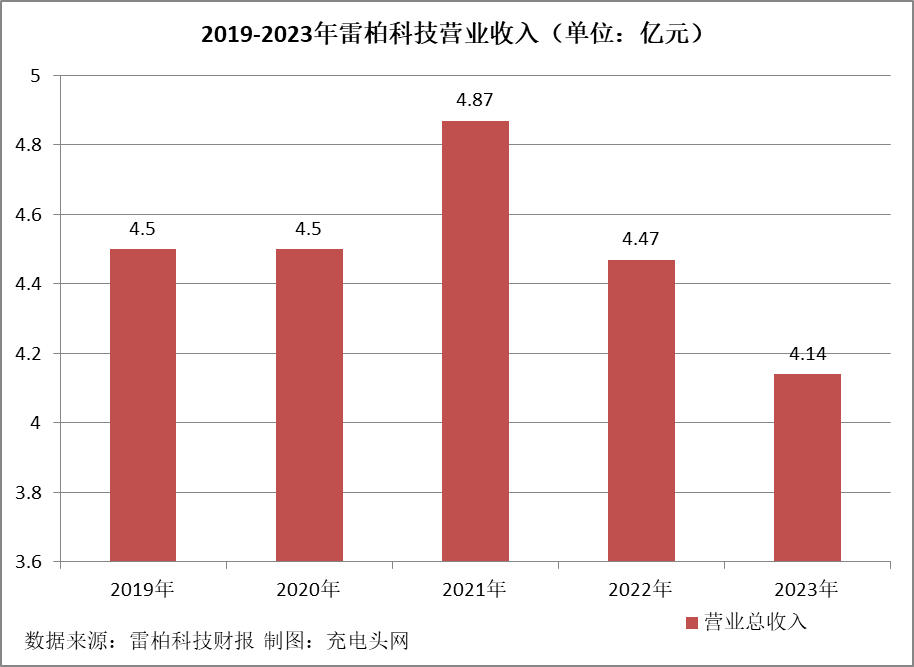 根据雷柏科技报告数据显示,2019-2023年,雷柏科技营业收入分别为4.50亿元、4.50亿元、4.87亿元、4.47亿元和4.14亿元,2019—2023年同比增长分别为-5.25%、0.09%、8.16%、-8.08%和-7.38%。