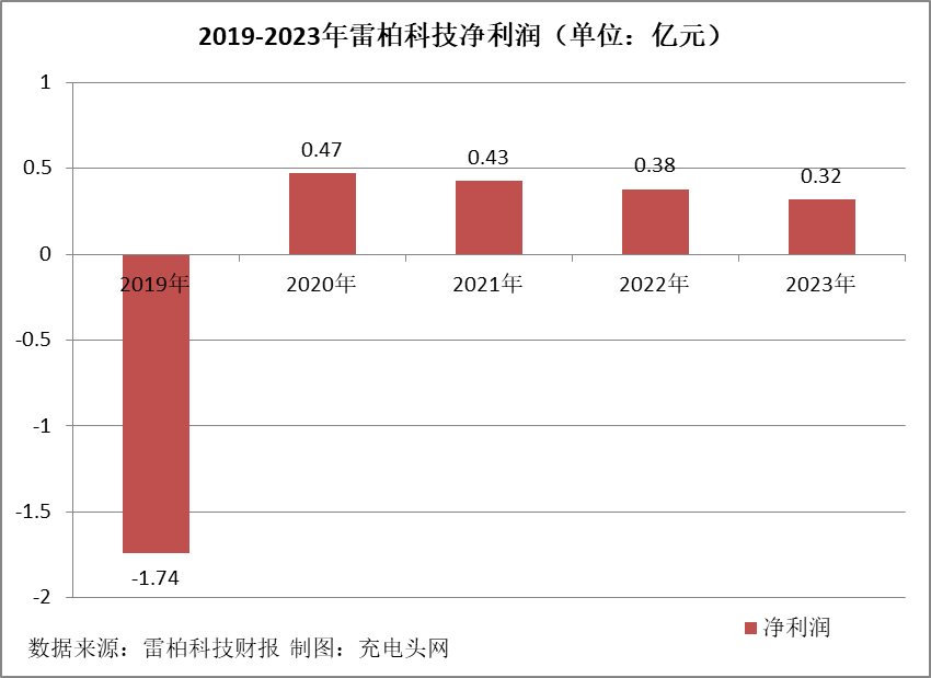 2019—2023年,雷柏科技净利润分别为-1.74亿元、0.47亿元、0.43亿元、0.38亿元、0.32亿元,同比增长-2255%、126.75%、-7.63%和-13.32%和-14.18%。