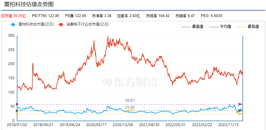 从雷柏科技近几年以来市值情况看,2023年5月8日,雷柏科技市值达到最高48.94亿元;2022年4月28日最低为24.87亿元。截至2024年4月9日,雷柏科技总市值为39.26亿元。