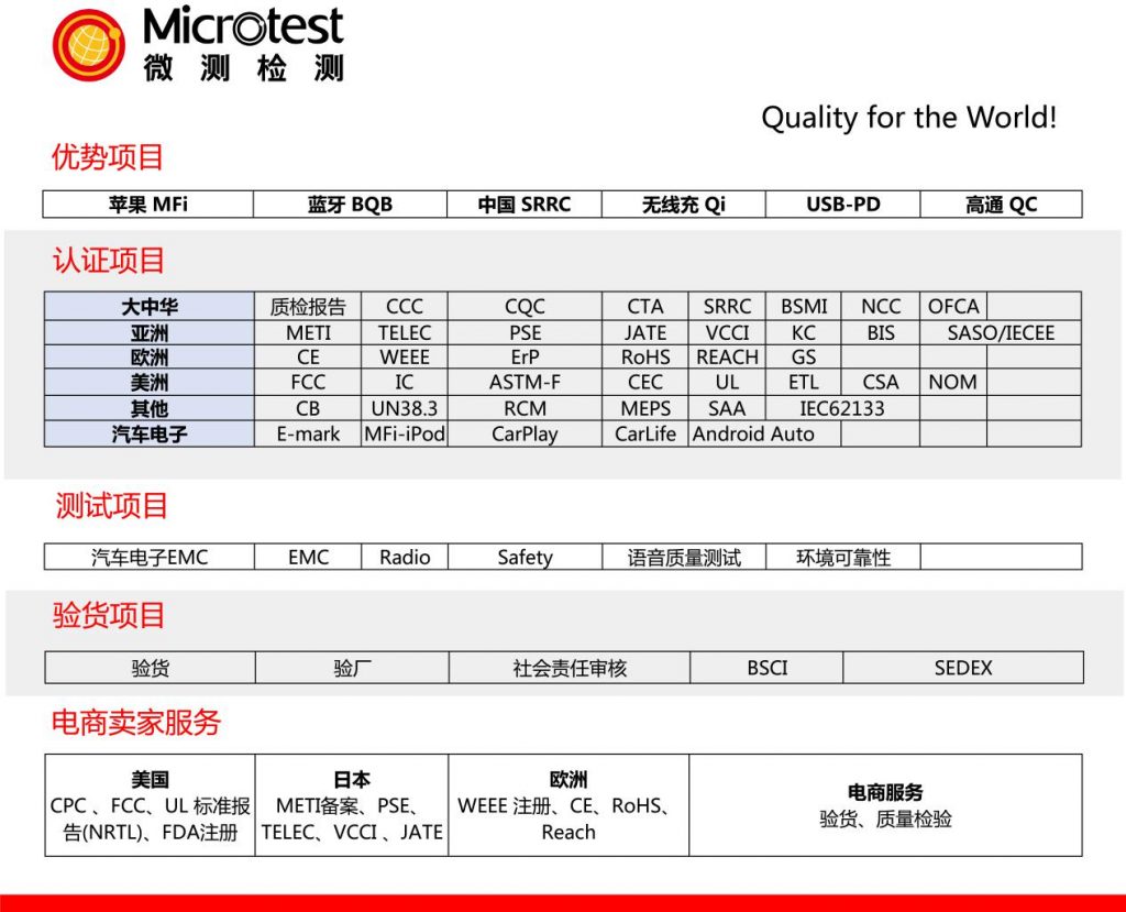 一站式:Microtest已建立起十余个专业实验室,企业通过微测检测就可以获得一站式的测试与认证解决方案;(EMC、RF、MFi、BQB、QI、USB、安全、锂电池、快充、汽车电子EMC、汽车手机互联、语音通话质量)