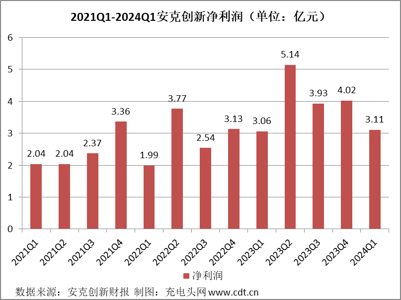 2021Q1-2024Q1安克创新归母净利润如下图所示。公司归母净利润最高是在2023Q2,为5.14亿元,归母净利润最低是在2022Q1,为1.99亿元。2024Q1公司实现归母净利润3.11亿元,同比增长1.60%。