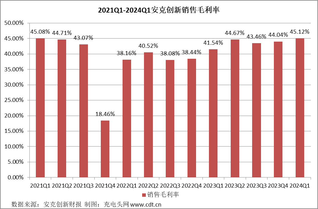 2021Q1—2024Q1年安克创新销售毛利率情况如下图所示。在此期间,2024Q1公司毛利率最高,为45.12%,2021Q4最低,为18.46%。
