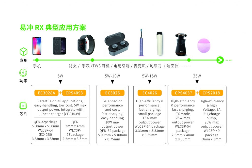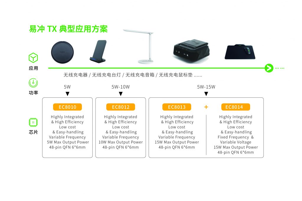 易冲半导体在无线充TX、RX端均有布局,方案优势明显,可以应用在手机无线充发射和接收、TWS等小功率应用、无线充电场所、智能办公家居无线充应用等等。