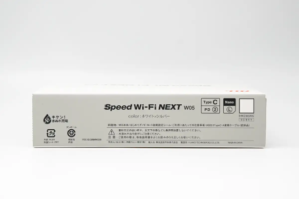 包装盒为简约纯白配色风格,正面印有“Speed Wi-Fi Next W05”,顶部为品牌LOGO。