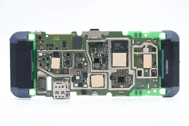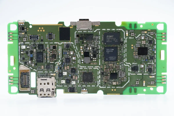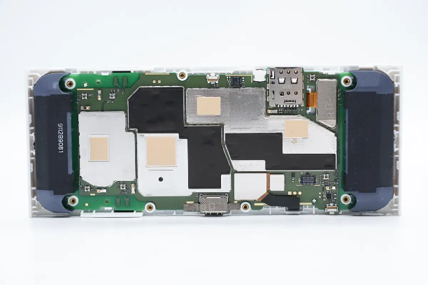 PCBA模块元件面一览,左上角设有电池插座和触摸屏插座,下方设有功放芯片,在左下角设有屏幕插座和SIM插槽。中间位置上方设有USB-C插座,下方是充电芯片,底部为射频收发器。在右侧设有调制解调器芯片,存储器和PMIC,最右侧设有蓝牙和无线SOC。
