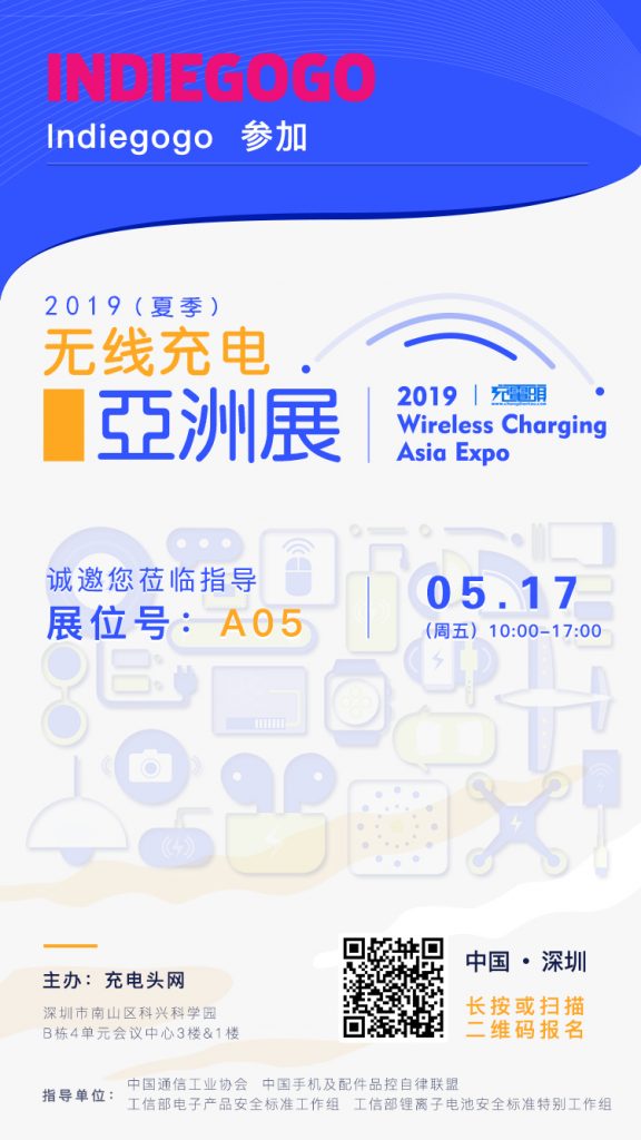 Indiegogo将在5月17日出席参加:2019(夏季)无线充电亚洲展,展台设在A05,欢迎大家前来咨询!
