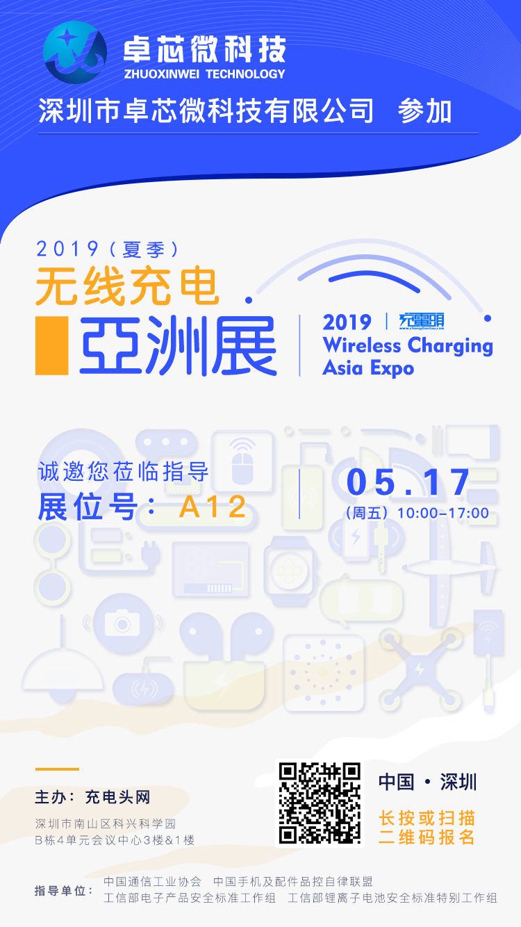 卓芯微科技将在5月17日出席参加:2019(夏季)无线充电亚洲展,展台设在A12,欢迎大家前来咨询!