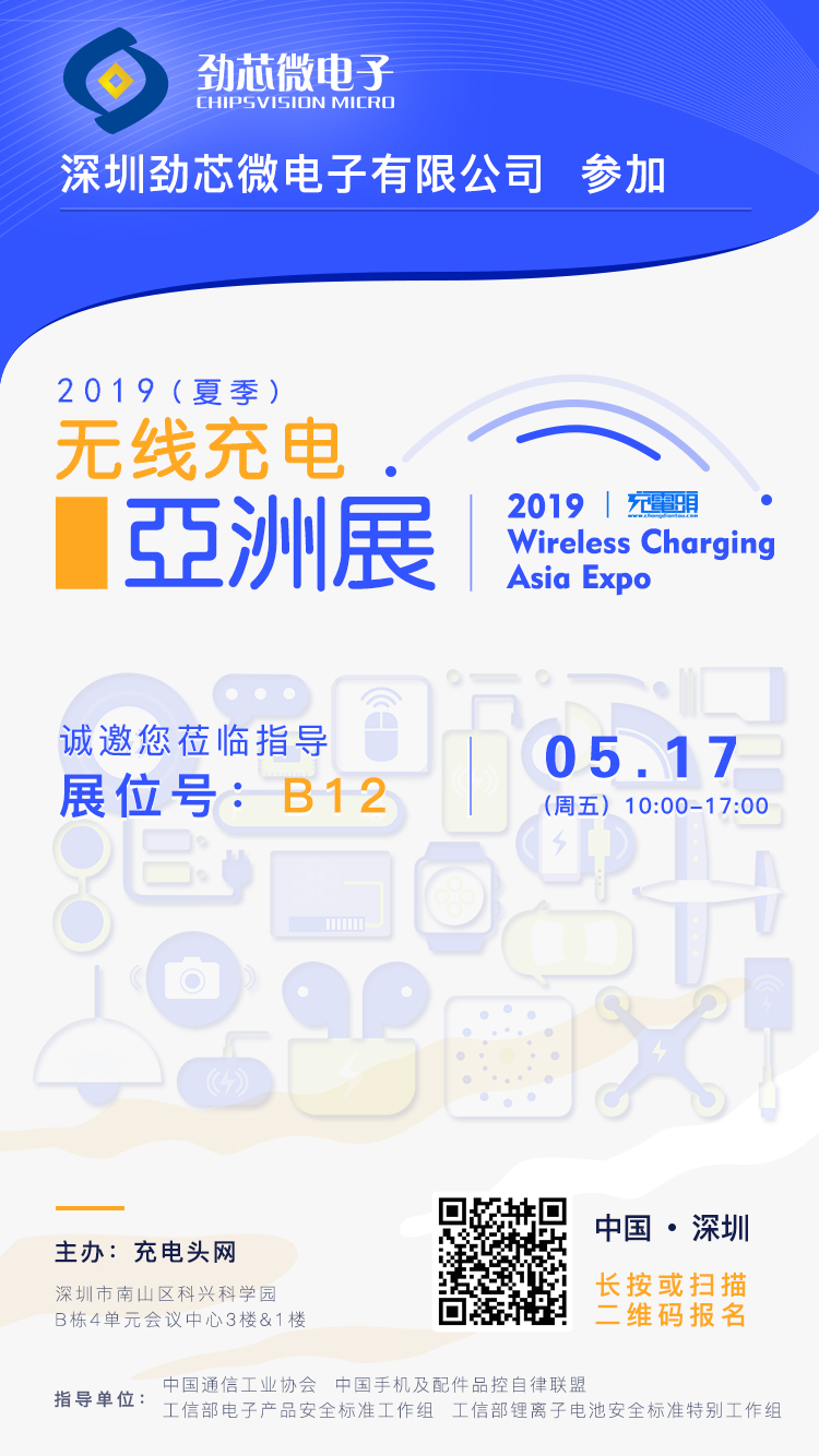 劲芯微将在5月17日出席参加:2019(夏季)无线充电亚洲展,展台设在B12,欢迎大家前来咨询!
