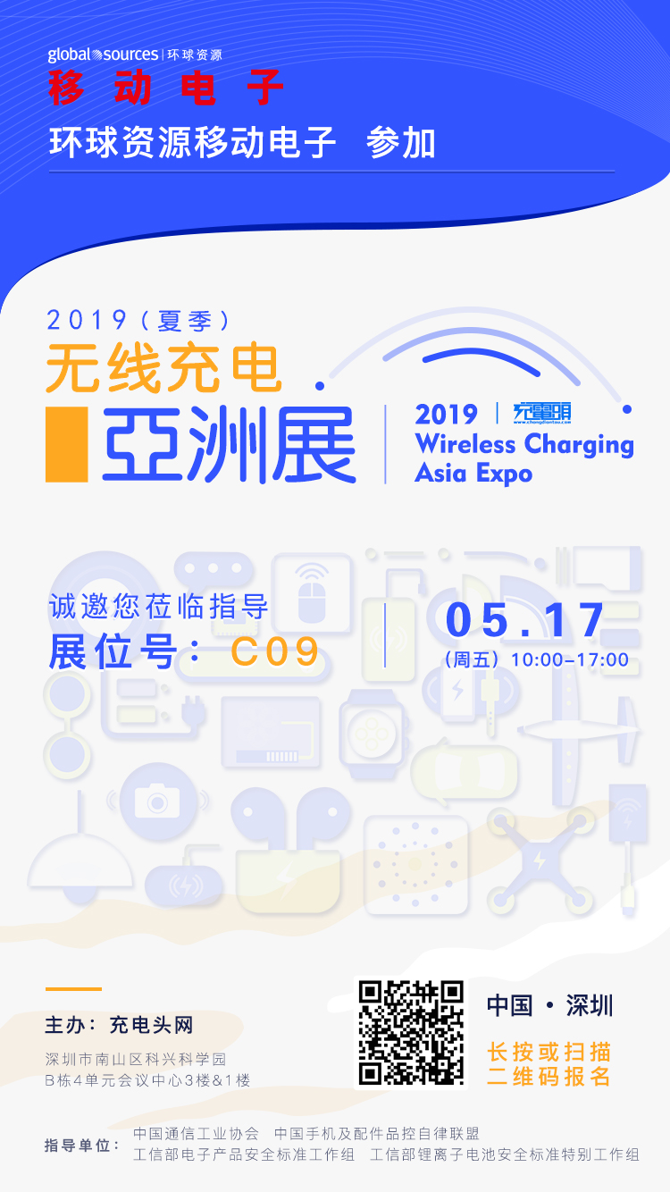环球资源Global Sources将在5月17日出席参加:2019(夏季)无线充电亚洲展,展台设在C09,欢迎大家前来咨询!