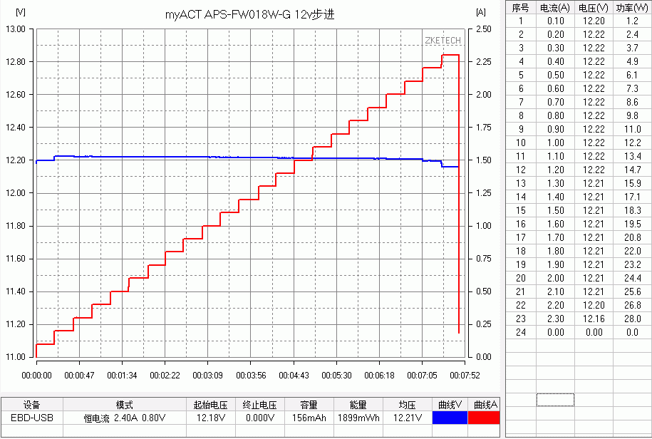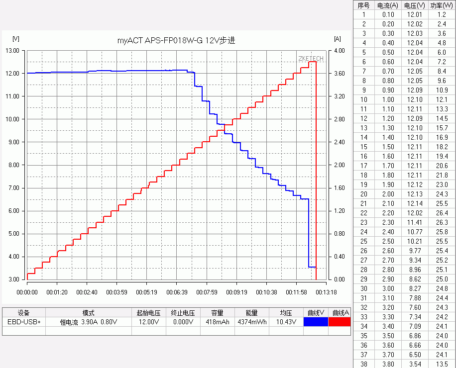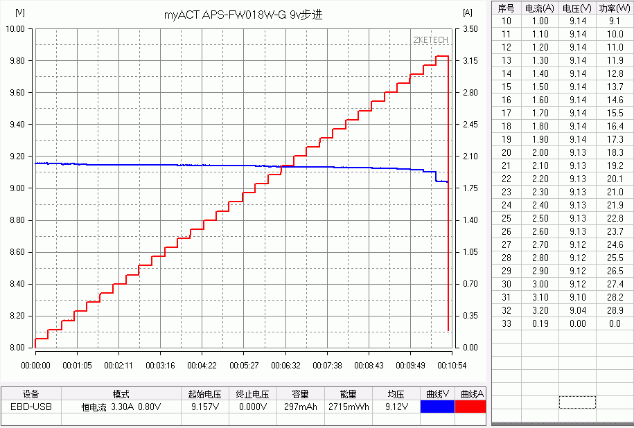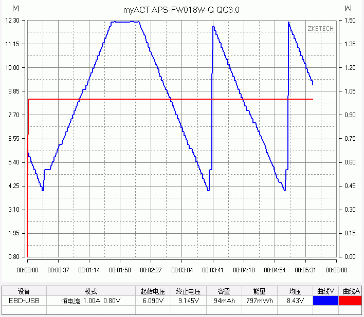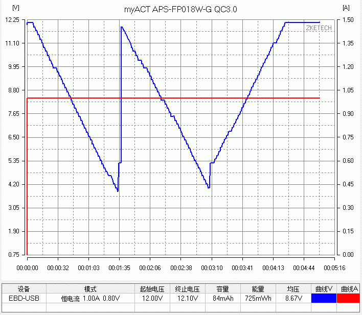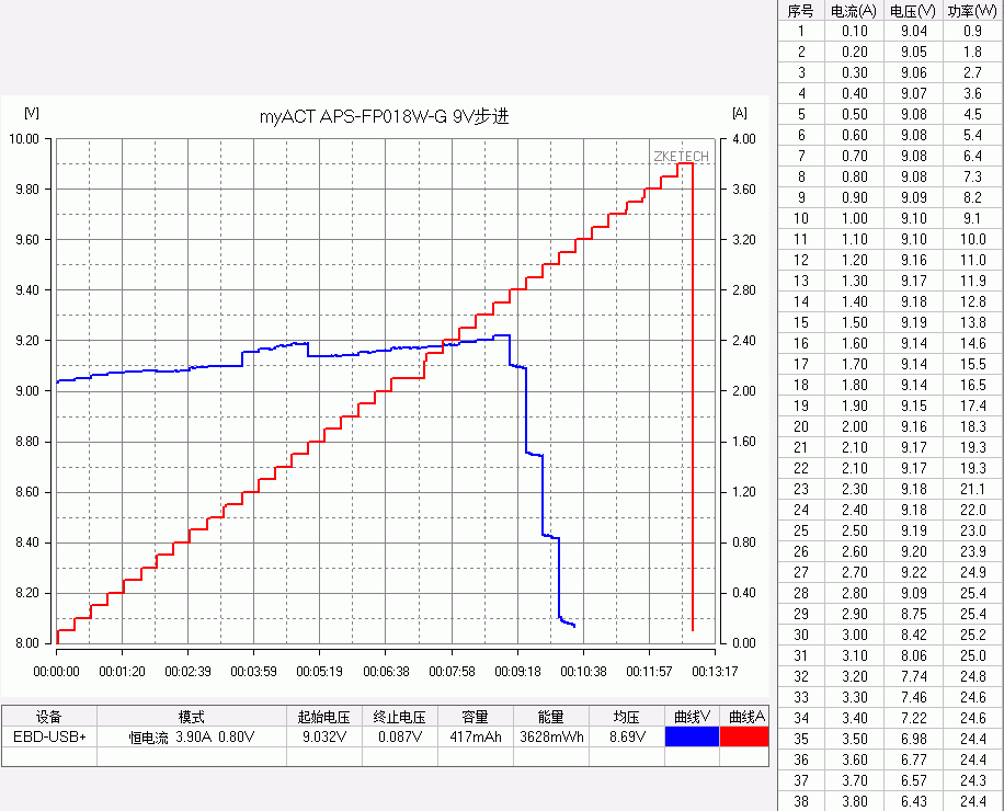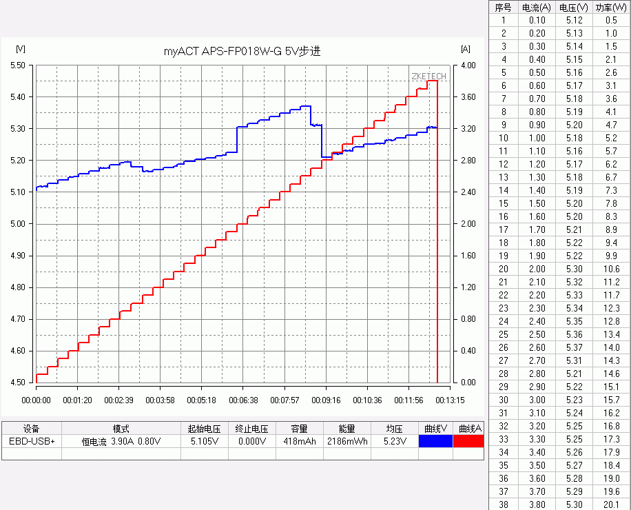 体积较小的扁圆款 FP,5V最大输出3.8A,最大功率20.1W。9V输出最大3.8A,最大功率25.4W,2.8A后转为恒功率输出模式,电流上升的话电压相应下 降,。12V输出同样是最大3.8A,最大功率26.4W,2.2A后转为恒功率输出模式,电流上升的话电压相应下降。3个常规电压档都带有线损补偿功 能,3.8A限流保护,QC3.0 200mV 步进正常诱出。