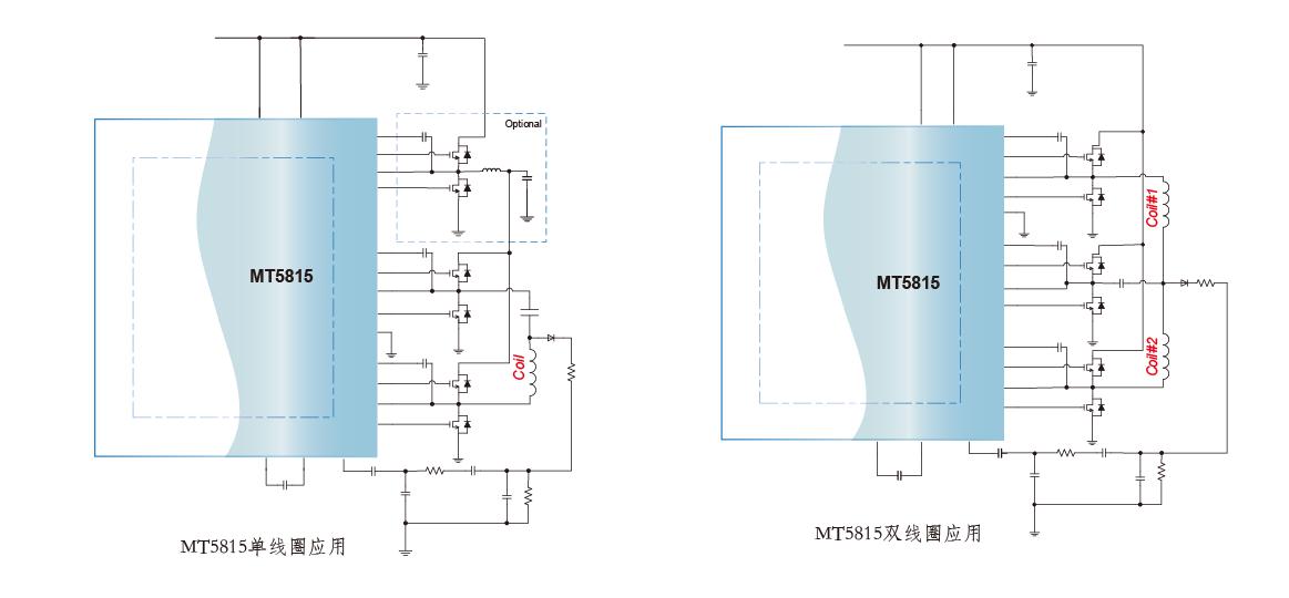 MT5815内部集成3路power N-MOSFET驱动器,通过内部灵活配置的PWM生成器可以同时实现调频、调压及调相的任意方案组合。单一芯片就可以完全支持市场上已知的主流单线圈及双线圈应用,客户根据需求可灵活进行配置。