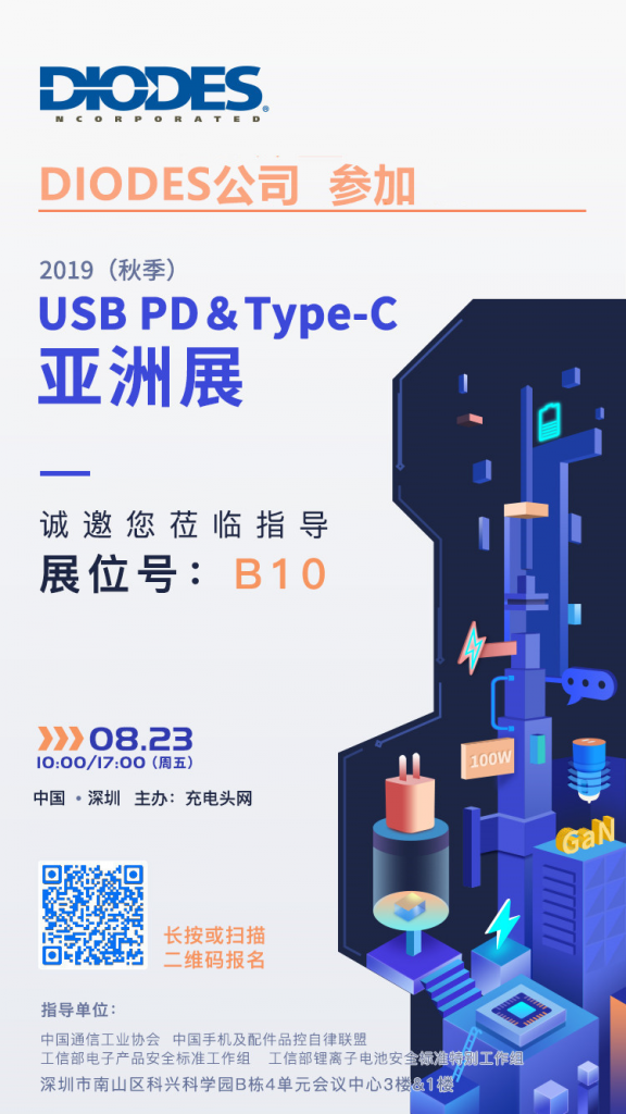 Diodes公司将于8月23日参加2019(秋季) USB PD&Type-C亚洲展,展位设在B10,需要了解快充电源全套解决方案、整流器、晶体管、MOSFET、保护装置等产品的观众可在展会当天移步B10展位详细交流。