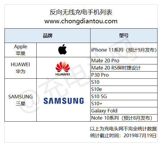 此外,有传言称即将发布的三星Note 10系列以及苹果iPhone 11系列新机也会支持反向无线充电。