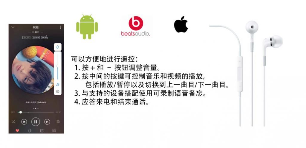 苹果耳机的音量加、音量减、音乐的播放和暂停、切歌以及通话的线控功能都能正常兼容