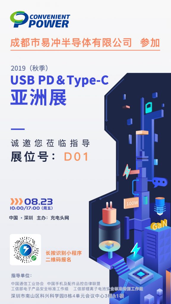 易冲半导体将在8月23日参加2019(秋季) USB PD&Type-C亚洲展,展位设在D01,需要了解USB USB PD方案、E-marker芯片的观众可在展会当天前往D01展台进一步交流。