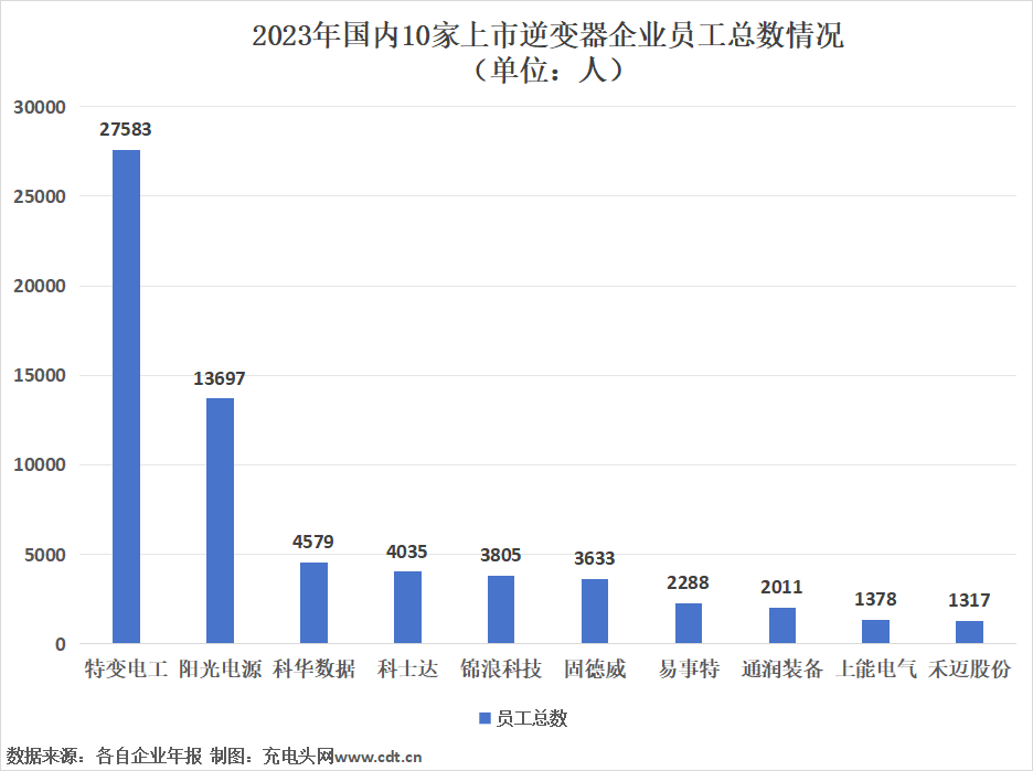 据充电头网不完全统计,特变电工的员工总数最多,达到27583人,其次是阳光电源和科华数据,分别为13697人和4579人。而禾迈股份和上能电气的员工数量相对较少,分别为1317人和1378人。