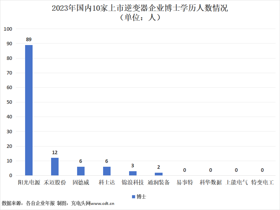 据充电头网不完全数据统计,阳光电源拥有最多的博士学历人才,共89人,显示出其强大的研发实力和对高端人才的重视。禾迈股份、固德威、科士达分别有12名、6名、6名博士,表现出较好的研发潜力。
