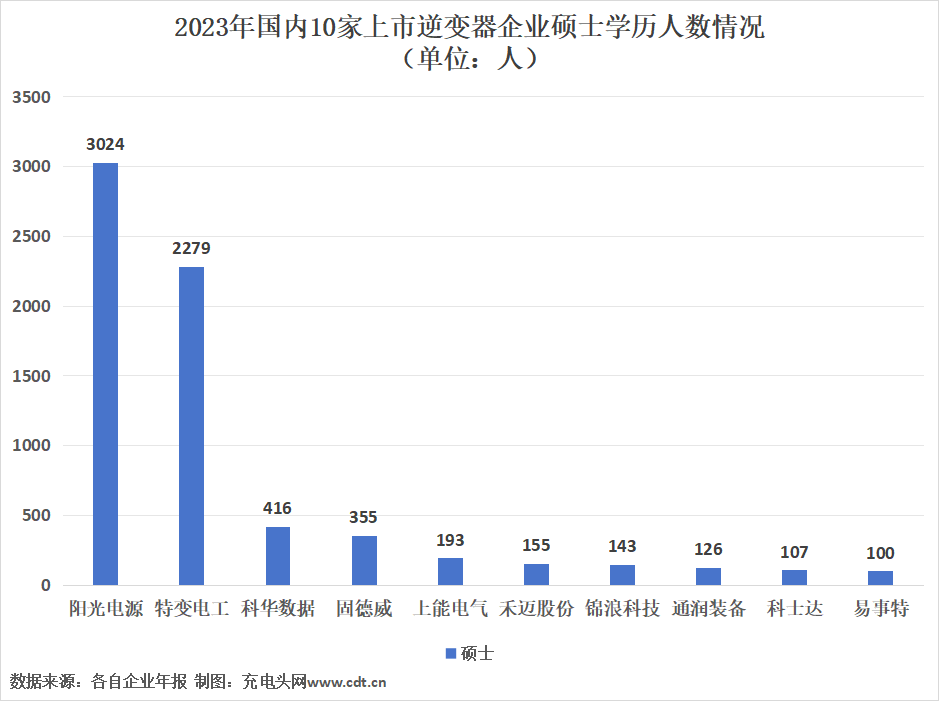 阳光电源和特变电工在硕士层次员工数量上显著领先,分别拥有3024人和2279人,这反映了两家公司对高学历人才的重视及其在行业内的竞争优势。科华数据和固德威也表现出对硕士学历人才的重视,分别有416人和355人。