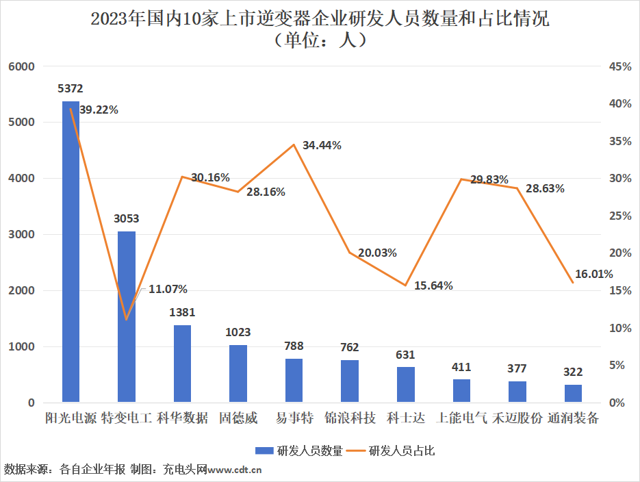 阳光电源研发人员数量高达5372人,占比39.22%,处于领先地位。特变电工研发人员虽有3053人,但占比相对较低为11.07%。科华数据、固德威、易事特、上能电气、禾迈股份研发人员占比均在20%以上,表现出对研发的重视。锦浪科技和通润装备研发人员占比相对较低。