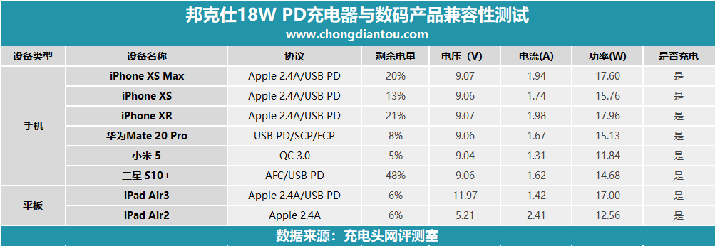 邦克仕18W PD充电器兼容性测试完毕,数据制成表格方便大家查看。这款充电器兼容性很不错,与USB PD、QC协议的测试设备均能兼容开启对应快充。