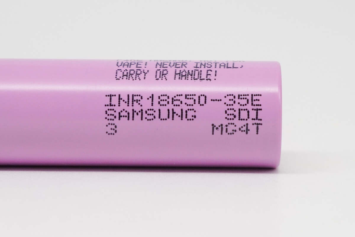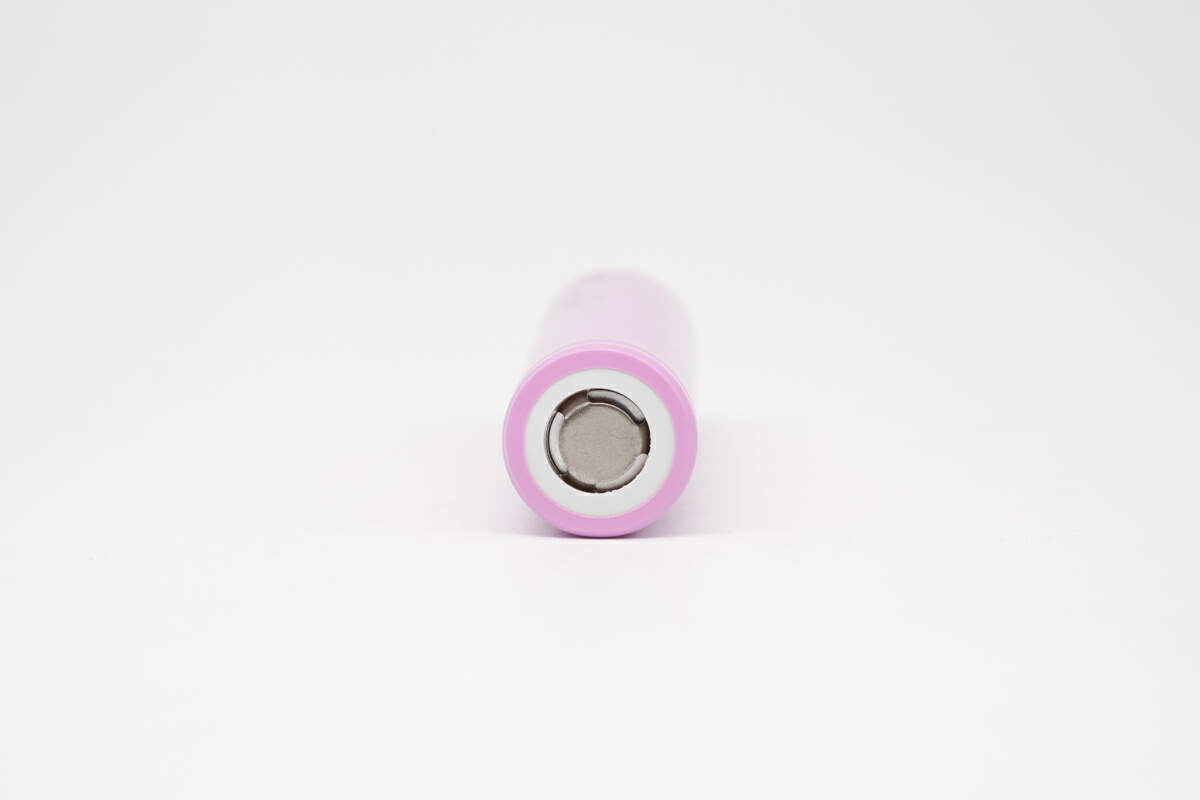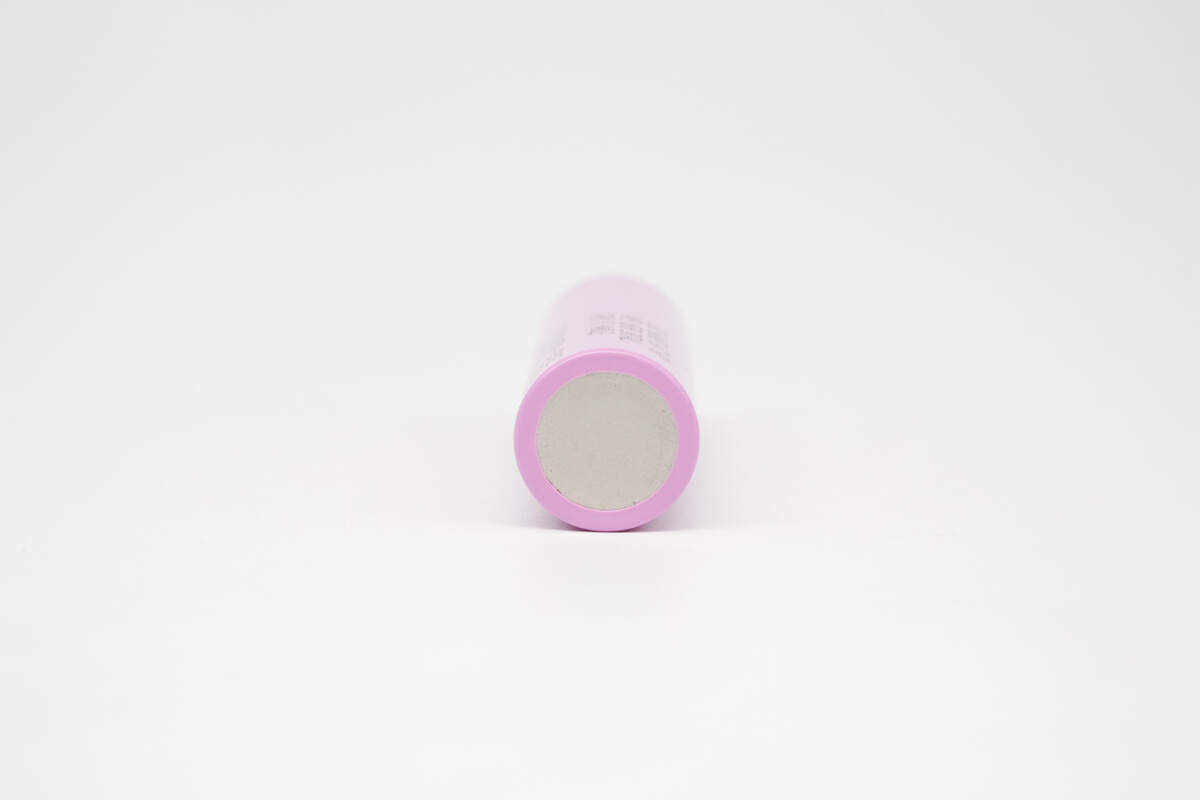 三星INR18650-35E电芯为圆柱形设计,采用粉色电芯套膜,下半部分拥有信息丝印。