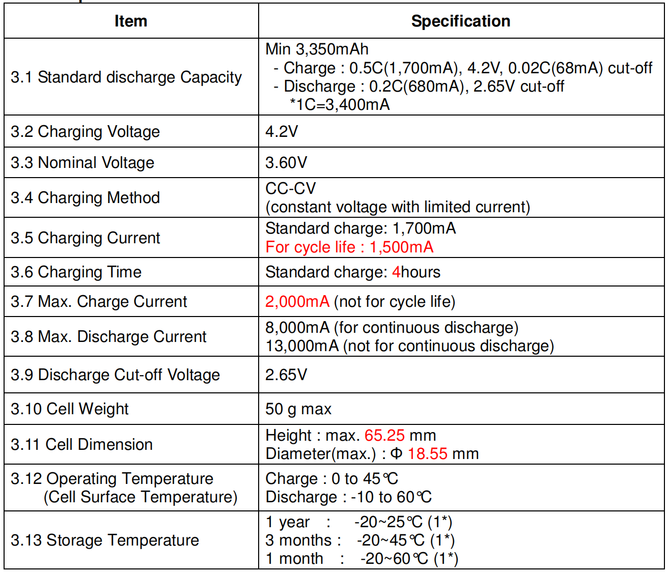 通过规格书了解到:标称容量:3350mAh@0.2C,充放电截止电压:4.2V/2.65V,充电模式:恒流恒压,标准充电:0.5C,最大充电电流:2000mA,最大放电电流:8000mA,最大瞬时放电电流:13000mA。