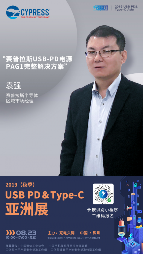 赛普拉斯半导体区域市场经理 袁强确认出席2019(秋季)USB PD&Type-C 亚洲大会,并将在现场为大家带来《赛普拉斯USB-PD电源PAG1完整解决方案》主题演讲。