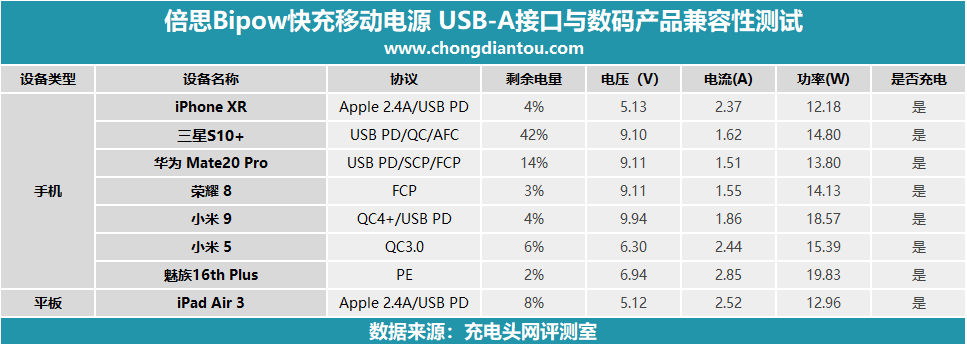 通过对比可以发现倍思Bipow快充移动电源不管是USB-A还是USB-C接口,整体兼容性都非常好,对市面上大部分的设备都能实现快充。
