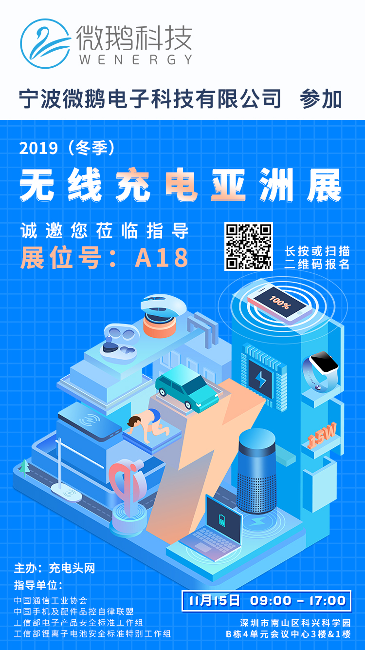 温馨提示:微鹅科技将参加11月15日中国深圳召开的2019(冬季)无线充电亚洲展,展位设在A18,需要了解远距离无线充电技术的观众,可在展会当天前往展位详细交流。