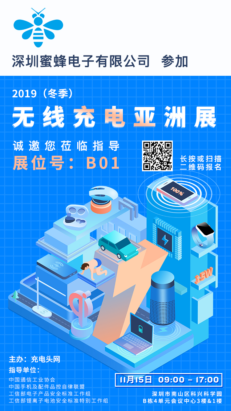 温馨提示:蜜蜂电子将参加11月15日中国深圳召开的2019(冬季)无线充电亚洲展,展位设在B01,需要了解高性价比无线充电方案的观众,可在展会当天前往展位详细交流。