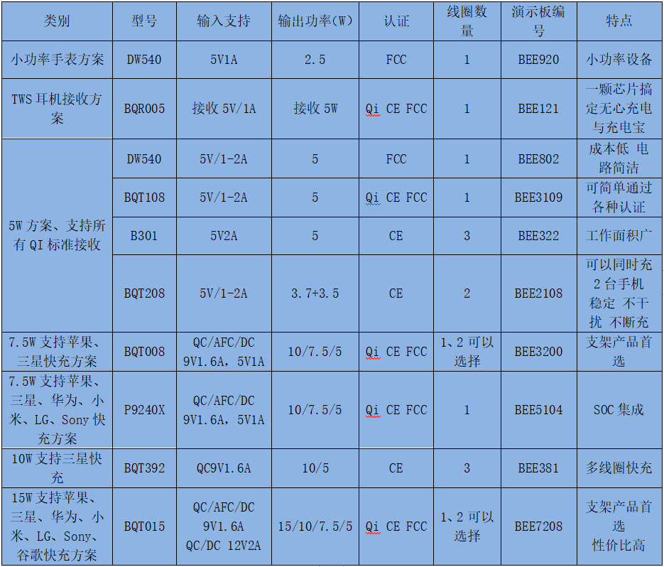 BQT015是一款无线充电专用IC。可配备 单个线圈或者2个线圈。控制输出功率高达15W,兼容EPP协议,支持QC2.0、QC3.0、AFC快充协议,5V1A、直流9V、12V可作为电源输入,支持三星、苹果、华为、小米、LG、SONY、谷歌等手机快充。