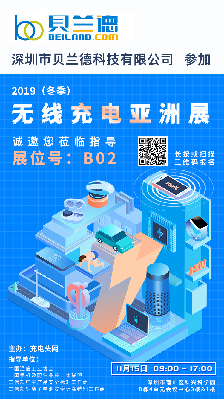 温馨提示:贝兰德科技 将参加11月15日中国深圳召开的2019(冬季)无线充电亚洲展并发表演讲,展位设在B02,需要了解高性价比无线充电方案的观众,可在展会当天前往展位详细交流。