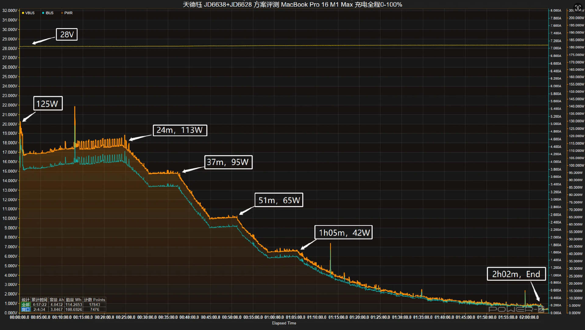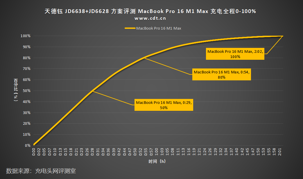 绘制出折线图,可以看出,这款天德钰 JD6638+JD6628 方案为 MacBook Pro 16 M1 Max 充电至50%耗时29分钟,充至80%耗时54分钟,充至100%耗时2小时02分钟。
