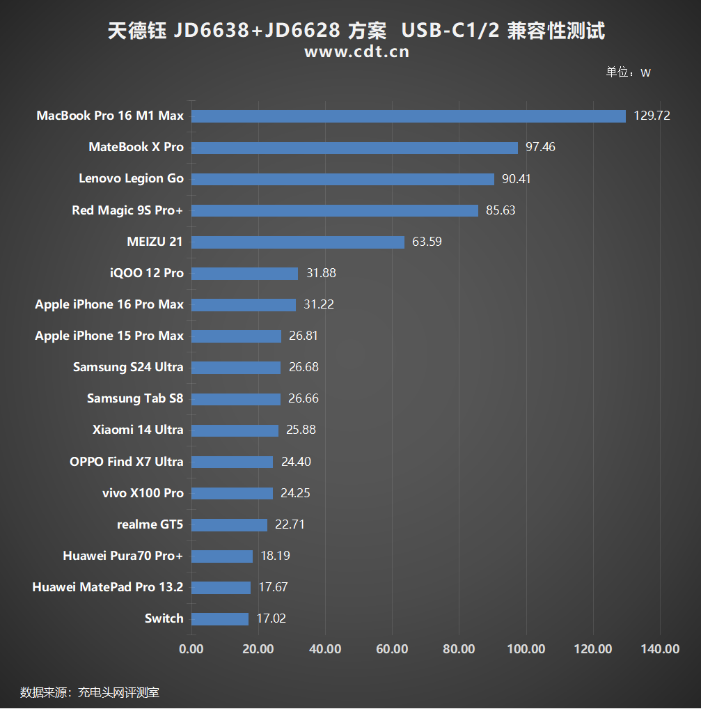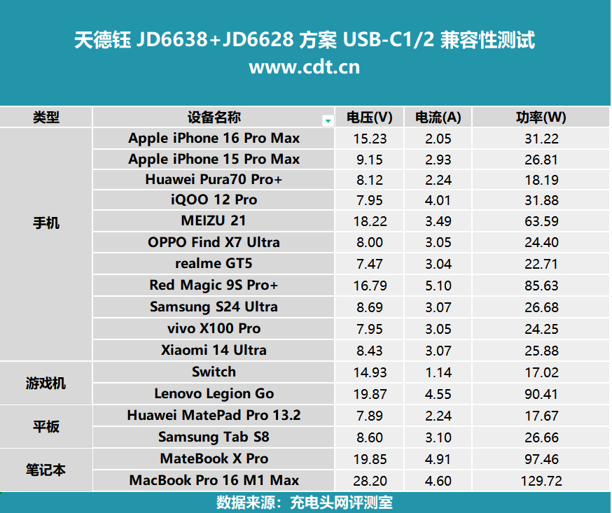 天德钰 JD6638+JD6628 方案支持 UFCS、QC3+、FCP、SCP、AFC、PD3.1、AVS、PPS、QC5、DCP和Apple2.4A等充电协议,在充电测试中,天德钰 JD6638+JD6628 方案可以给主流手机、平板电脑,其充电功率维持在17-86W之间,实测笔记本设备充电最高功率为129.72W,红魔、魅族支持大功率PPS手机充电功率达58.63W、63.59W,其次,支持UFCS协议的设备,如realme GT5、OPPO Find X7 Ultra 充电功率维持在22W以上,兼容性非常不错。充电器 USB-C1、C2 同时输出时,实测给两台大功率移动电源同时充电能达到65W+65W的功率。