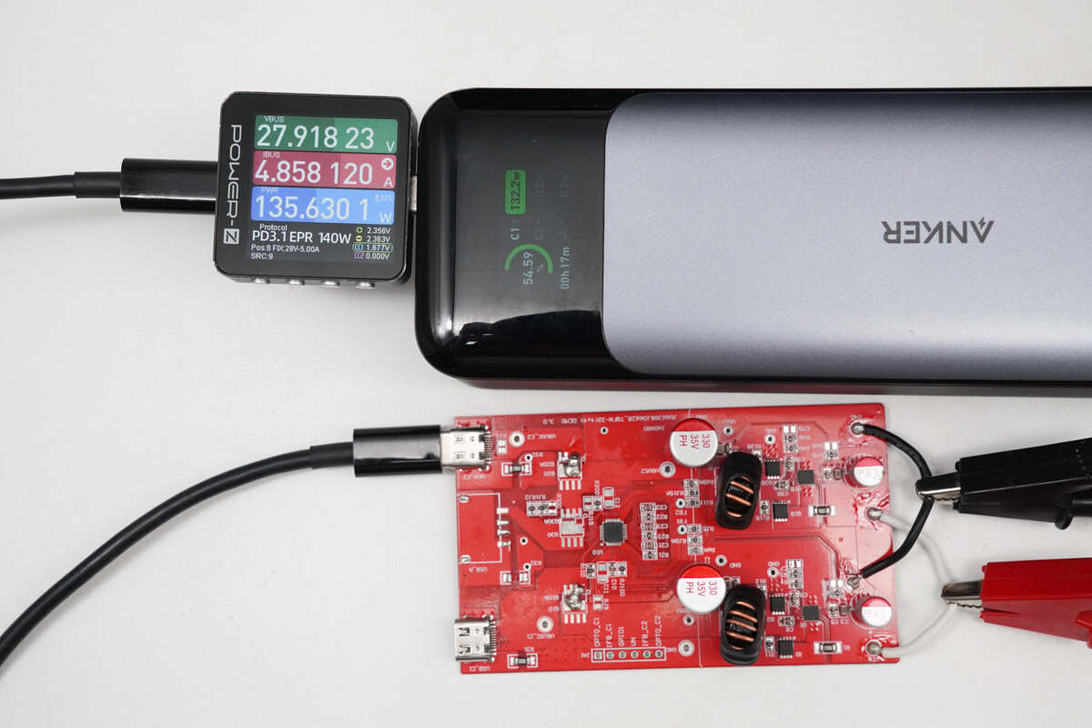 将安克737移动电源连接充电器的任一Type-C口,使用 POWER-Z KM003C 测试仪读取功率为 27.92V 4.86A 135.63W,握手PD3.1协议。
