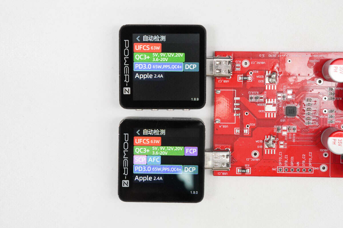 双口同时输出时,使用POWER-Z KM003C 读取 Type-C1和C2 端口快充协议,实测支持 UFCS、QC3+、FCP、SCP、AFC、PD3.0、AVS、PPS、QC4+、DCP和Apple2.4A等充电协议,C1和C2口支持同时输出65W+65W。