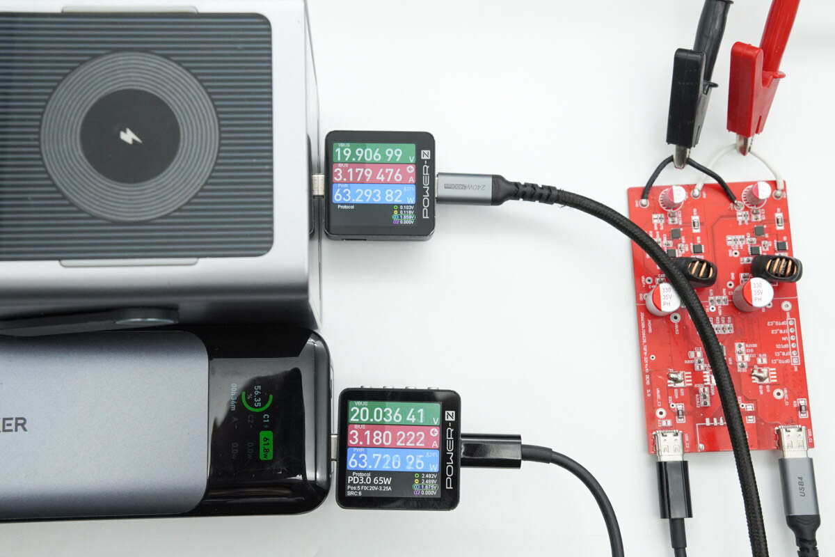 将充电器的 Type-C1 和 Type-C2 端口连接两台大功率移动电源,其充电功率分别可达 63.29W、63.72W,支持 65W+65W 功率分配。