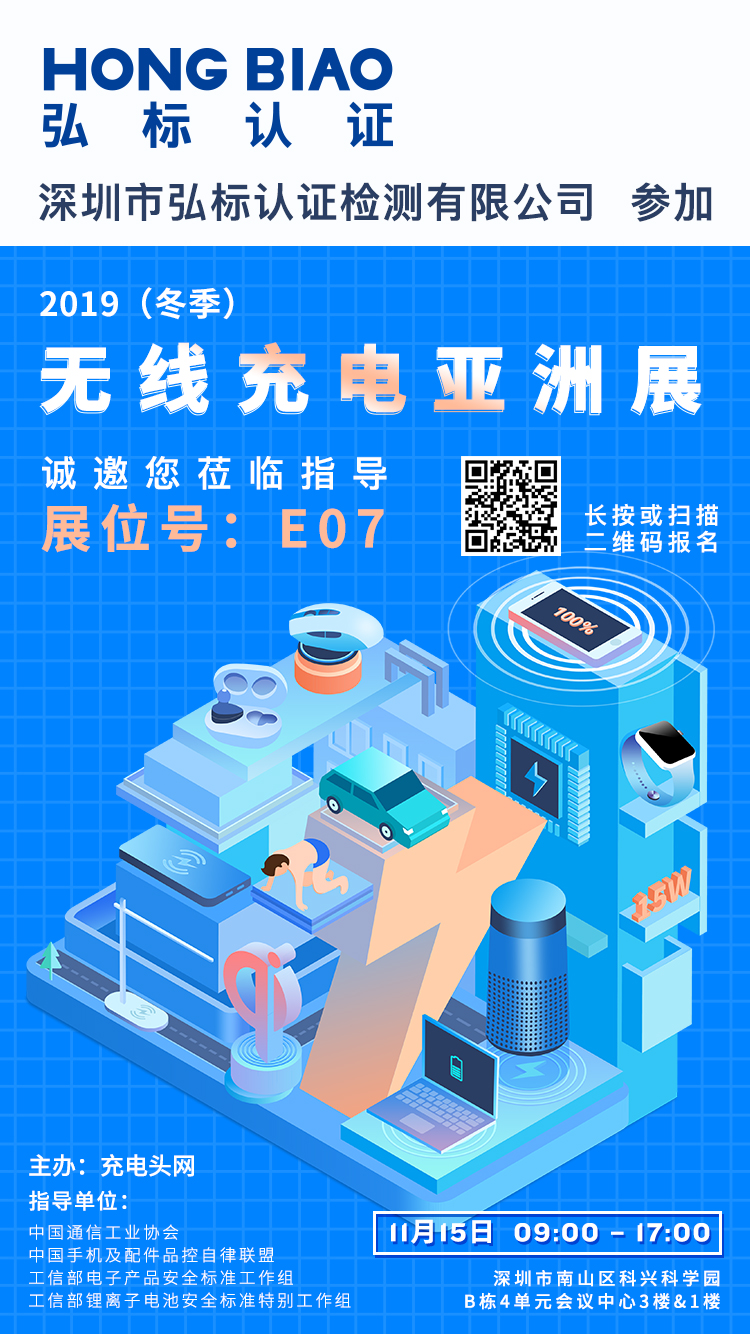 温馨提示:弘标认证 将参加11月15日中国深圳召开的2019(冬季)无线充电亚洲展,展位设在E07,需要了解无线充Qi认证的观众,可在展会当天前往展位详细交流。