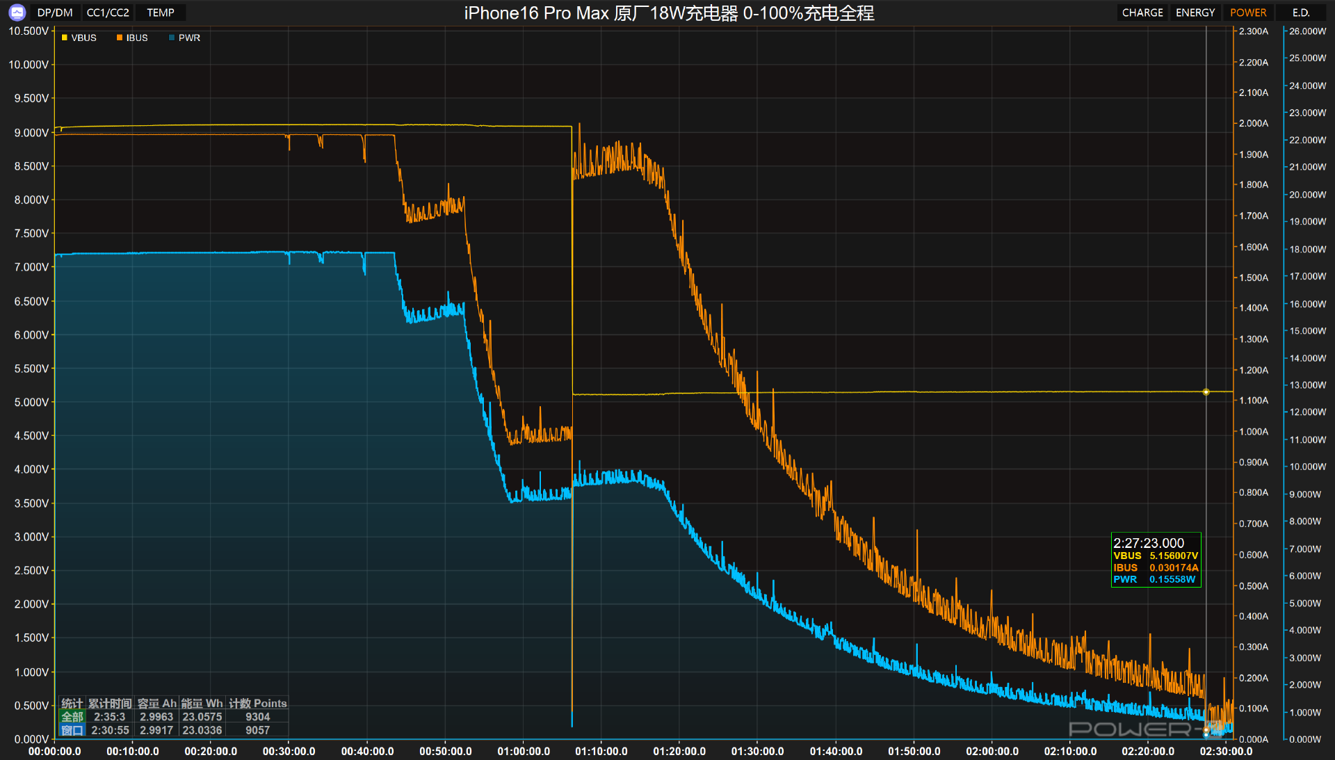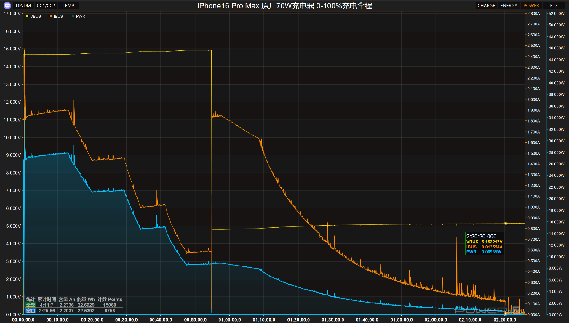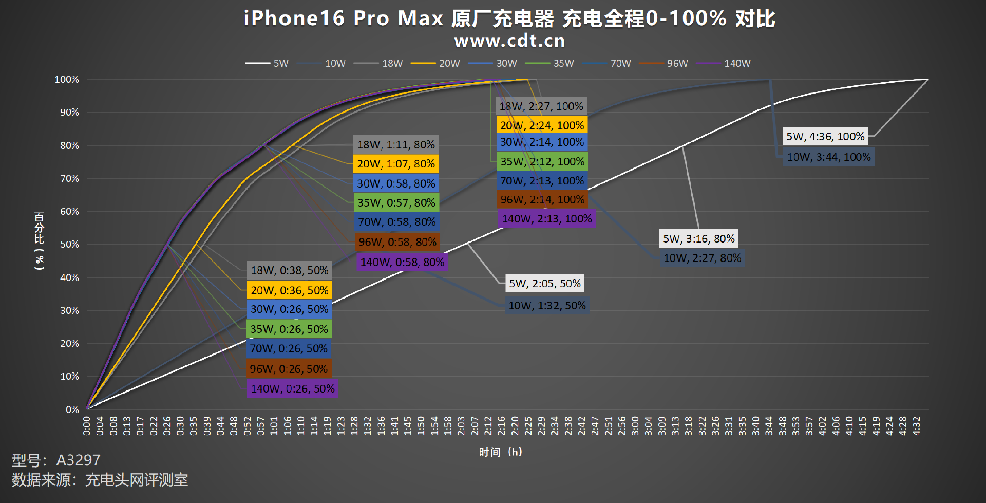 以上为苹果5W、10W、18W、20W、30W、35W、70W、96W、140W充电器对 iPhone 16 Pro Max手机的满电测试耗时,可以看到20W以上充电器充电时的曲线图均为相同的阶梯式变化,充电耗时在区间内,且充电全程折线图基本重合,无明显变化,同时也无出现充电损坏等情况,各新机用户可放心使用,20W-140W原厂充电器充电时间基本在2小时12分钟至2小时14分钟,在选购原厂充电器时,更推荐使用20W以上的充电器。