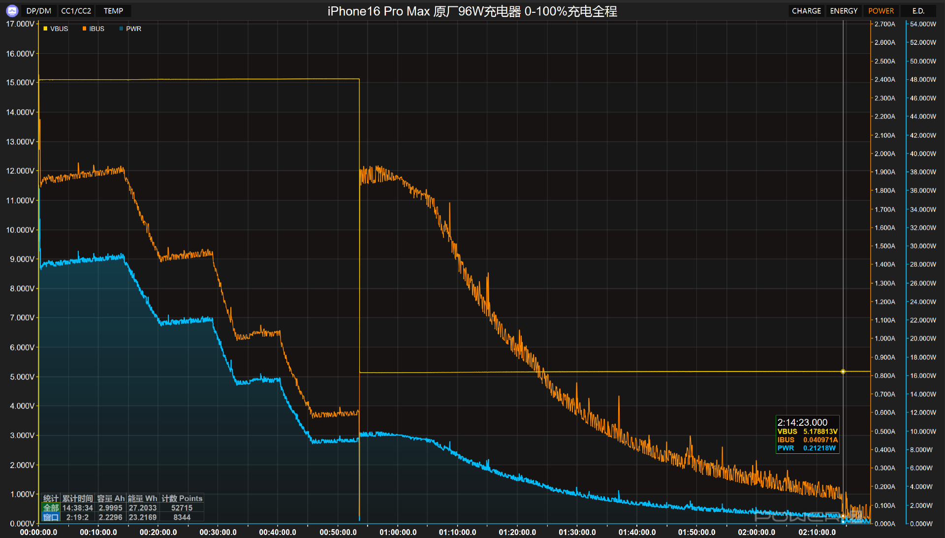 绘制出折线图,可以看出苹果96W充电器为 iPhone 16 Pro Max 充电耗时2小时14分钟。