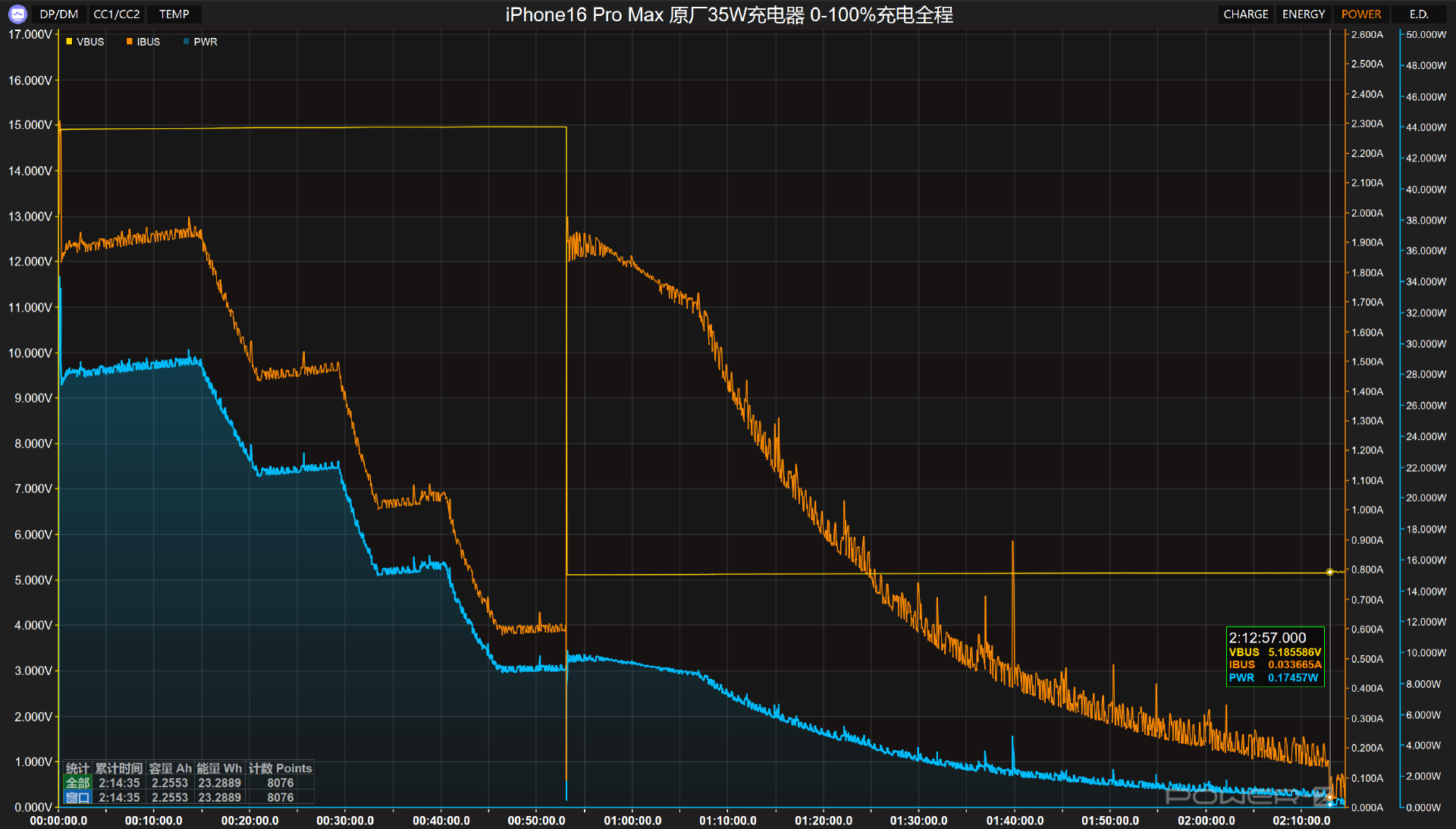 绘制出折线图,可以看出苹果35W充电器为 iPhone 16 Pro Max 充电耗时2小时12分钟。