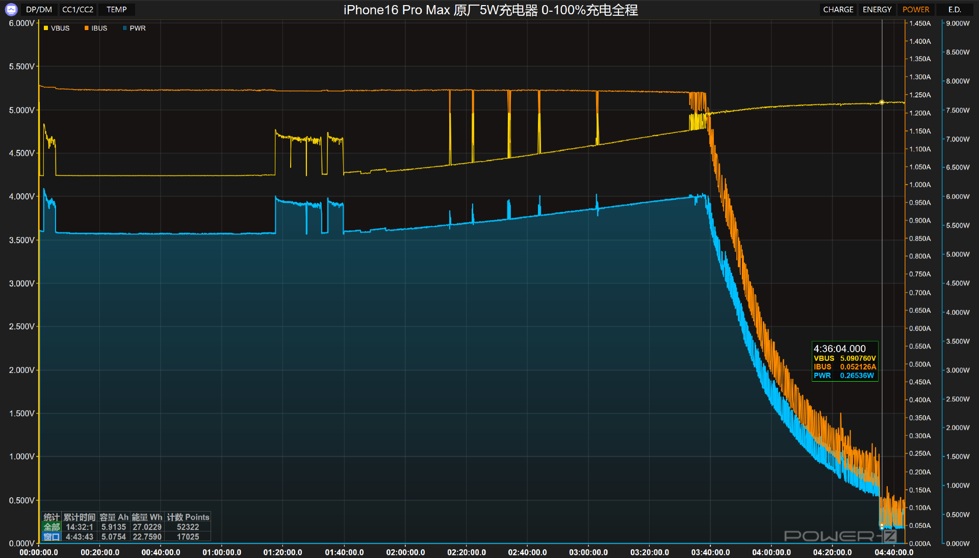 本次测试设备方面充电头网选用了 iPhone16 Pro Max 与原装 5W、10W、12W、18W、20W、30W、35W、70W、96W、140W充电器作为测试对象,分别将原装充电器与 iPhone16 Pro Max放置于25℃的恒温箱中,并接通电源,测试结果如下。
