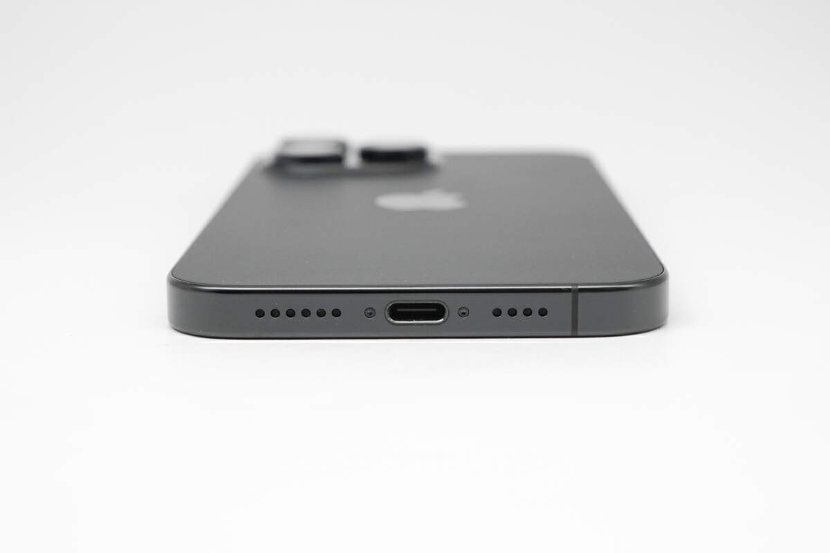 iPhone 16 Pro Max 手机底侧中框部分的充电端口为 USB Type-C 物理接口,支持DisplayPort USB 3 (最高可达 10Gb/s)数据传输规格,端口两侧为扬声器开孔。