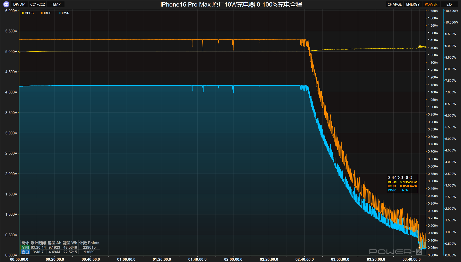 绘制出折线图,可以看出苹果10W充电器为 iPhone 16 Pro Max 充电耗时3小时44分钟。