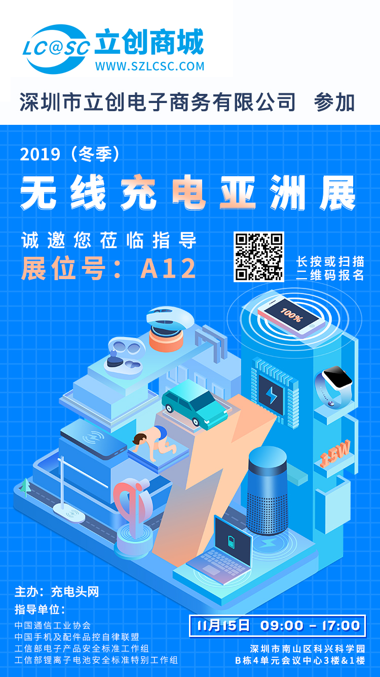 温馨提示:立创商城 将参加11月15日中国深圳召开的2019(冬季)无线充电亚洲展,展位设在A12,需要了解无线充元器件采购的观众,可在展会当天前往展位详细交流。