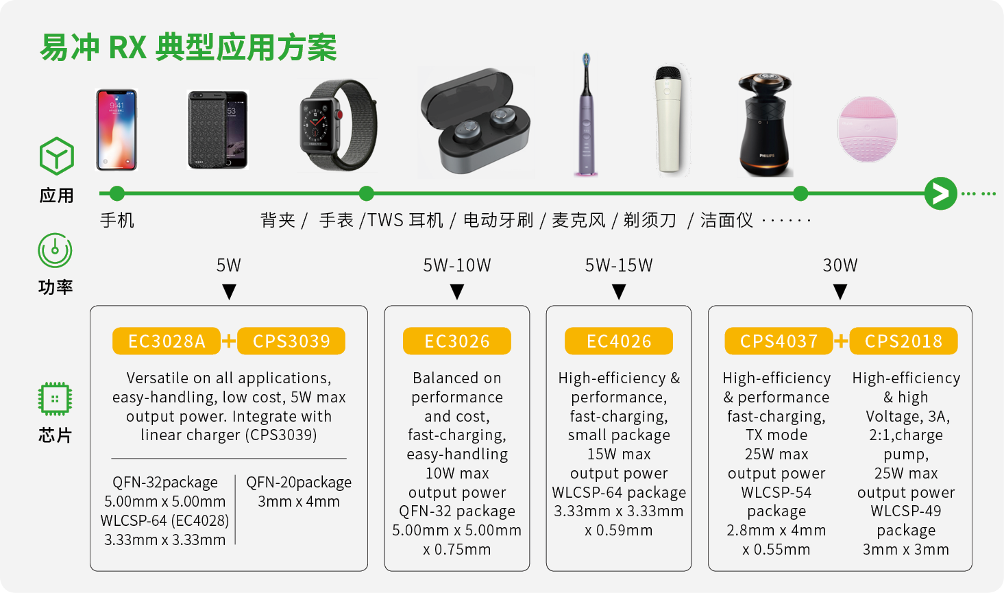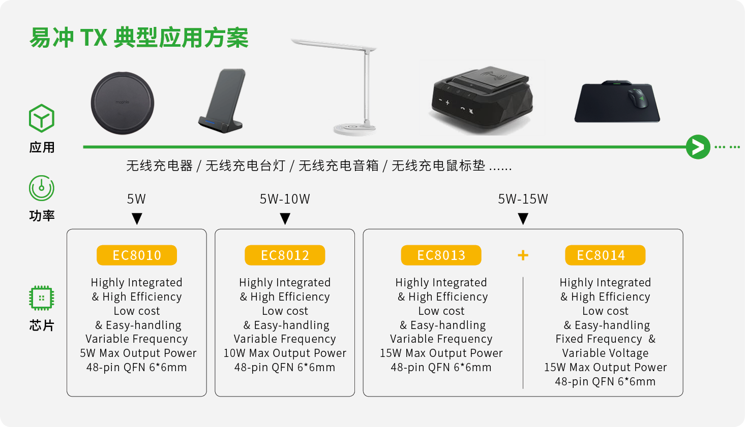 易冲半导体在无线充TX、RX端均有布局,方案优势明显,可以应用在手机无线充发射和接收、TWS等小功率应用、无线充电场所、智能办公家居无线充应用等等。