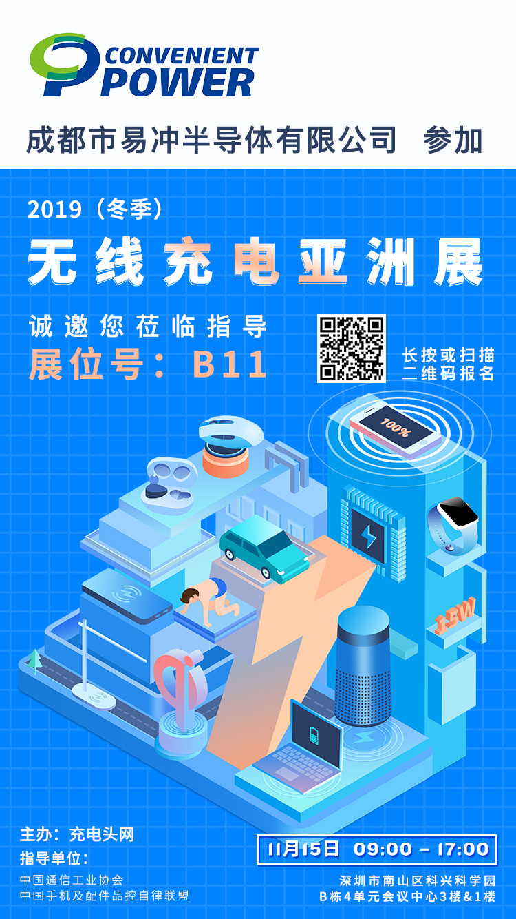 温馨提示:易冲半导体 将参加11月15日中国深圳召开的2019(冬季)无线充电亚洲展并发表演讲,展位设在B11,需要了解无线充芯片方案的观众,可在展会当天前往展位详细交流。