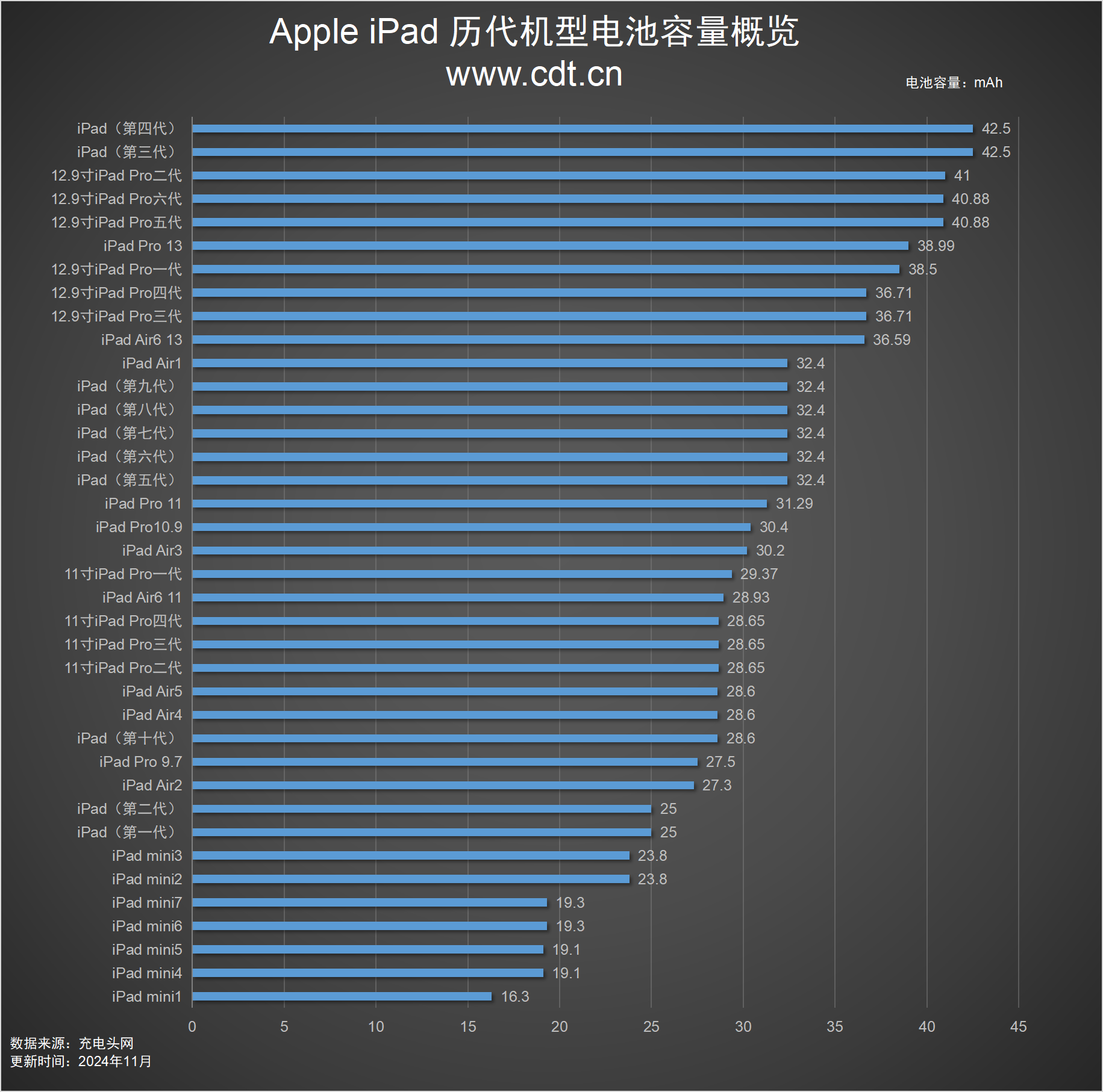 统计所有iPad机型电池容量并排列,可以看到,iPad数字系列第三、四代电池容量最高,可达42.5Wh,iPad mini系列机型包揽图表末位,最低为iPad mini1,容量为16.3Wh。
