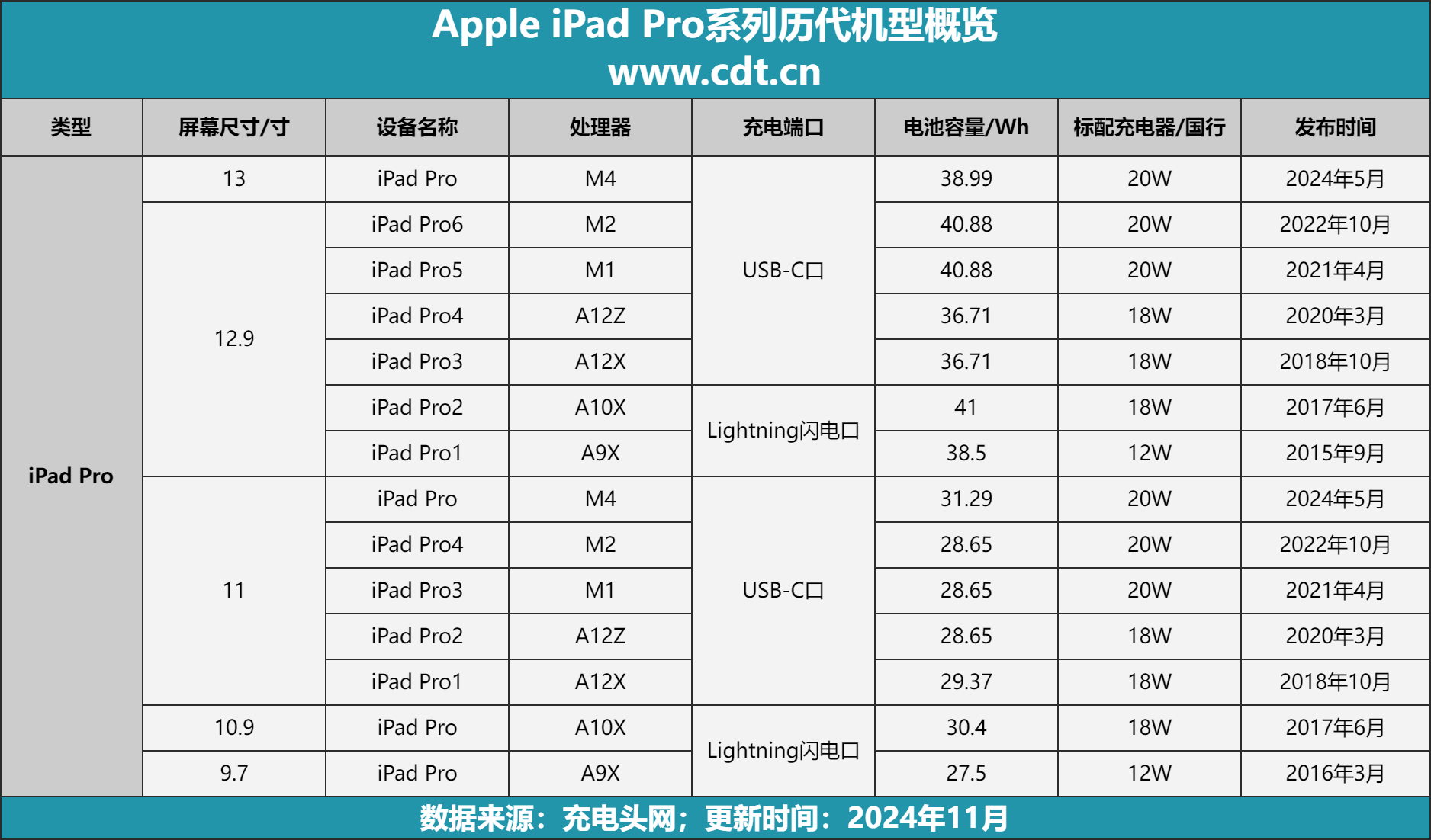 可以看到,基于iPad Pro系列的参数来看,屏幕尺寸方面从9.7寸升级到13寸,充电接口也迭代更换为USB-C接口,同时也开始支持ProMotion 自适应刷新率技术,电池电量数值却参差不齐。