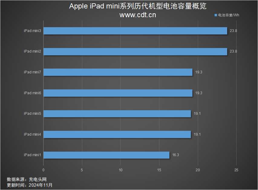 可以从柱形图中清晰看到,一代电池容量最低,为16.3Wh;二代与三代、四代与五代电池容量相当,分别为23.8Wh、19.1Wh;六代与七代电池容量相当,为19.3Wh,且同样搭配20W充电器。